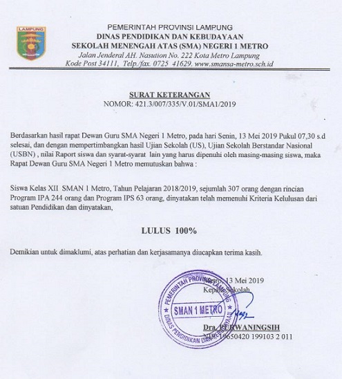 INFORMASI KELULUSAN SISWA KELAS XII SMAN 1 METRO TP. 2018/2019