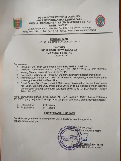 PENGUMUMAN KELULUSAN SISWA KELAS XII SMAN 1 METRO TP. 2021/2022