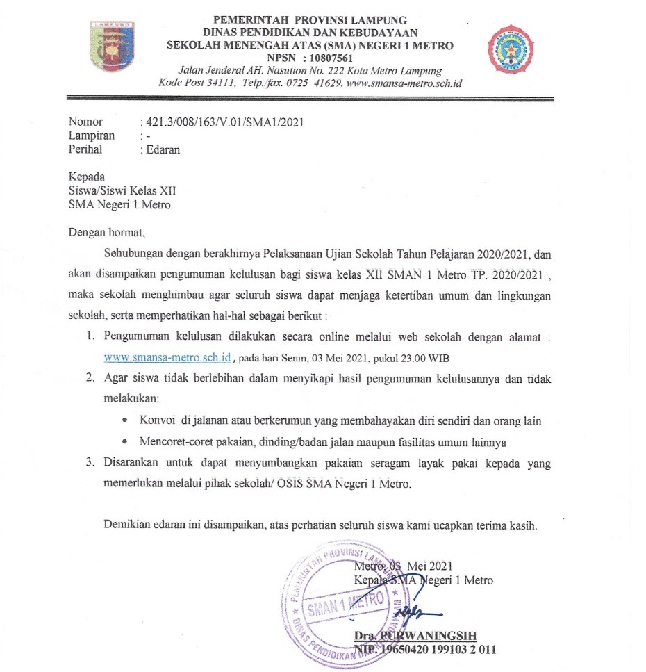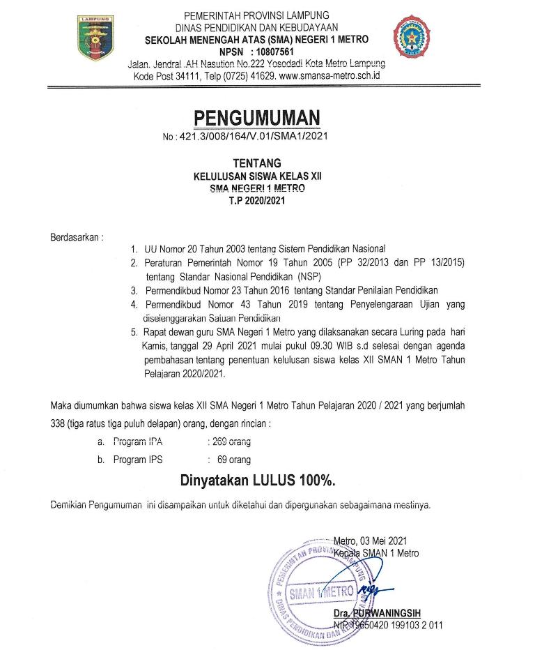 Pengumuman Kelulusan Siswa Kelas XII SMAN 1 Metro TP. 2020/2021